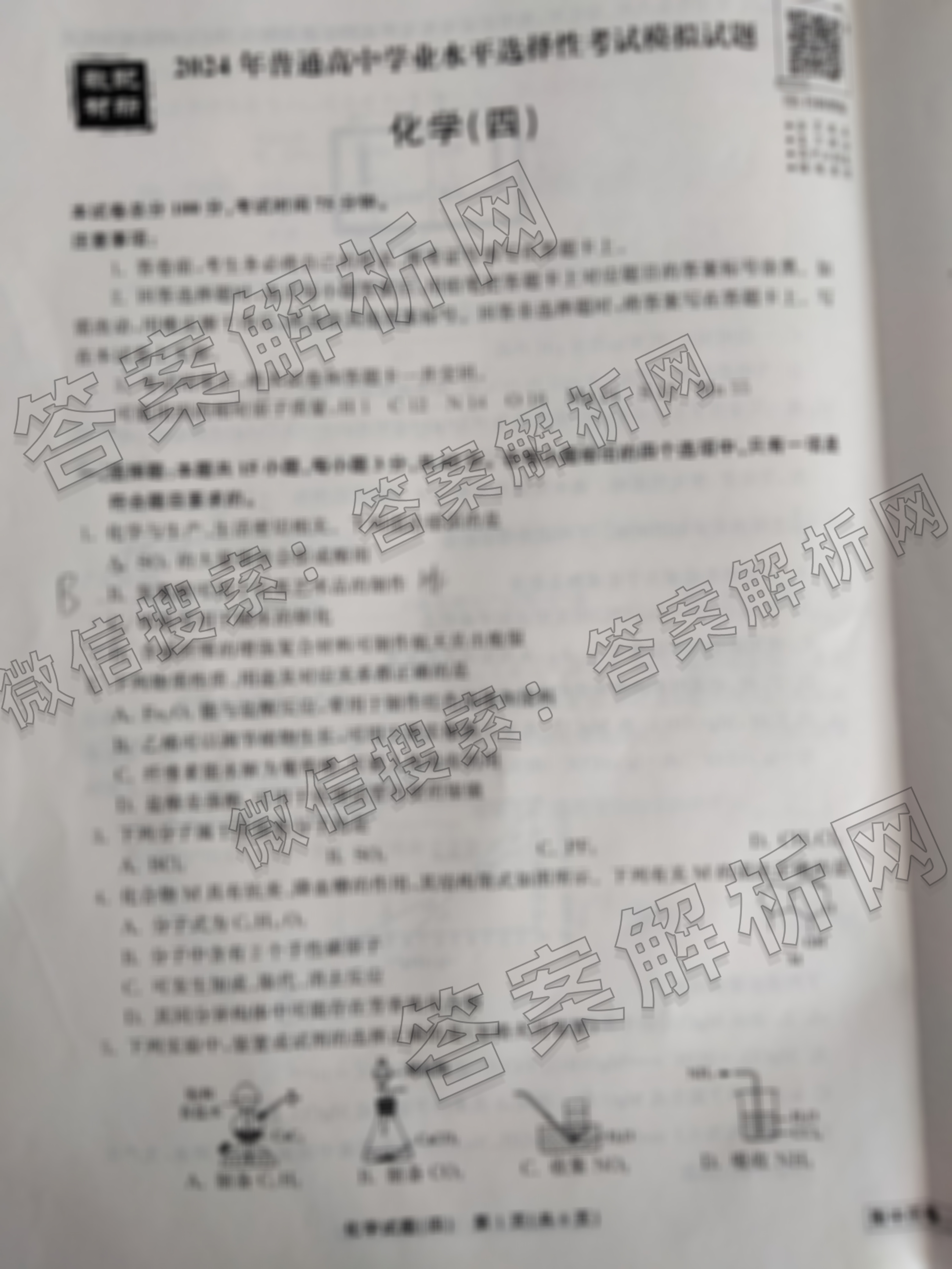 - (高三)衡中同卷调研卷 2024年普通高中学业水平选择性考试模拟试题(四)4化学(新教材版JX)试题