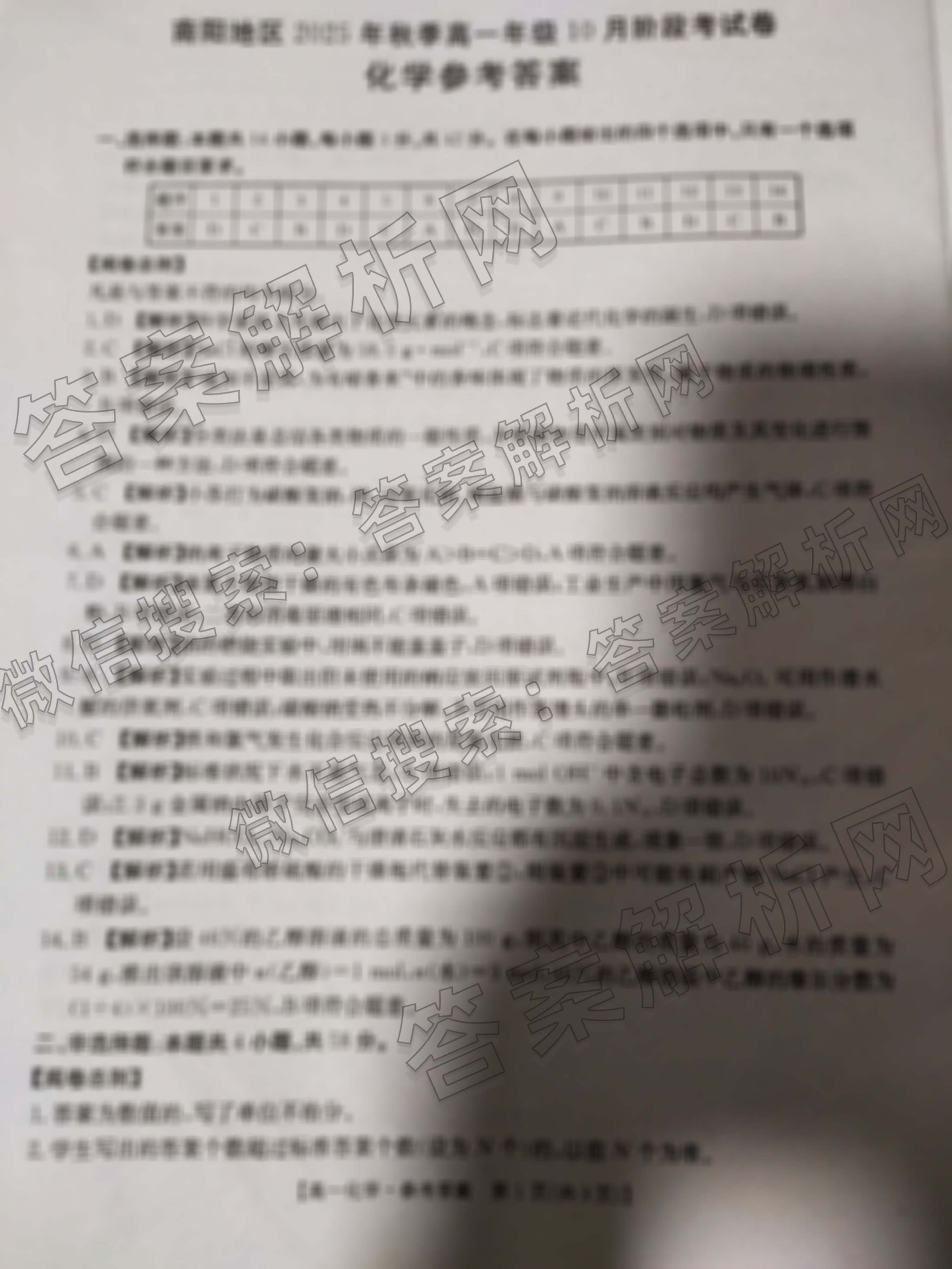 (高一)金太阳大联考·南阳地区2025年秋季年级10月阶段考试卷化学答案