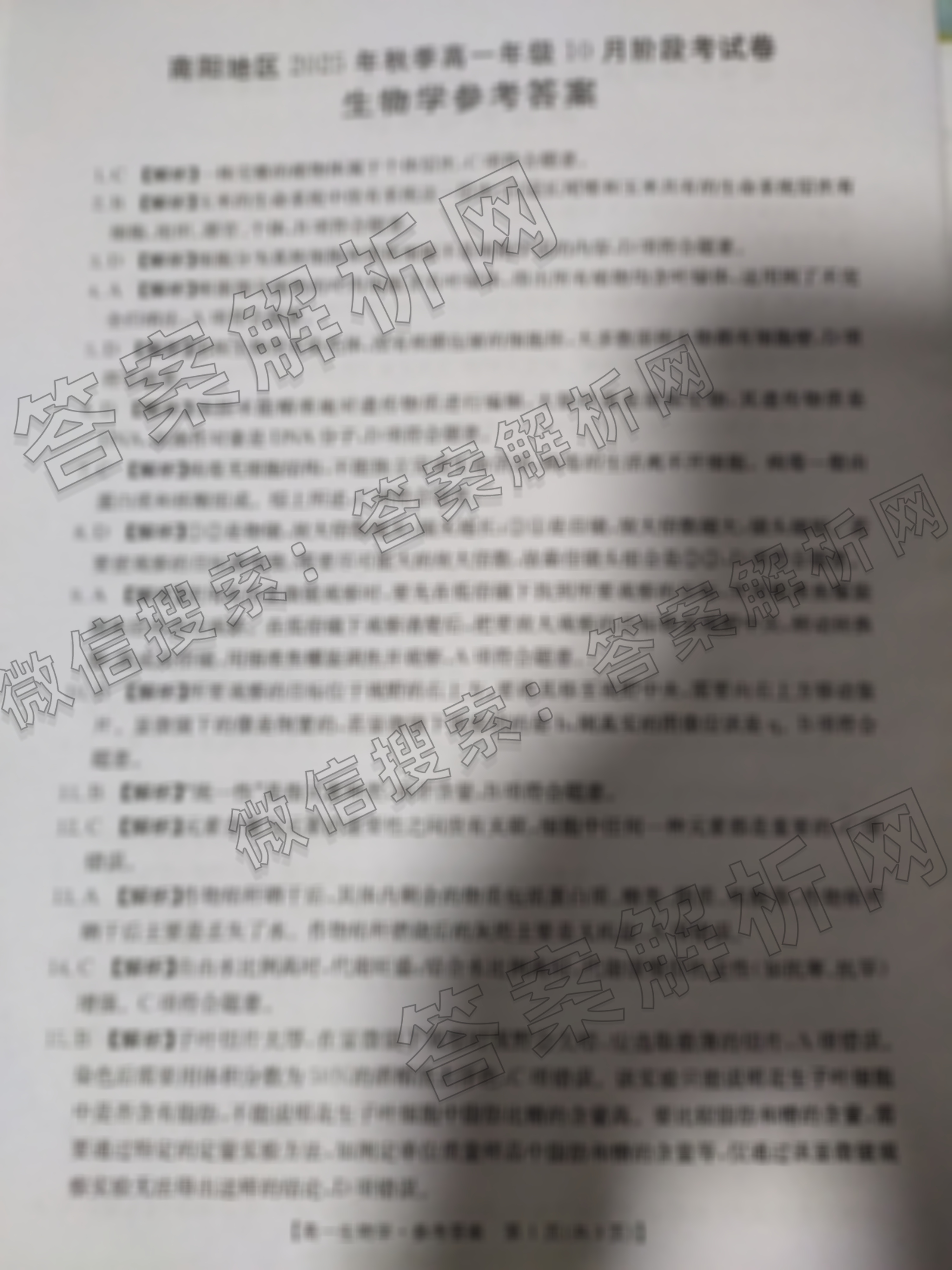 [高一]金太阳大联考南阳地区2025年秋季年级10月阶段考试卷生物答案