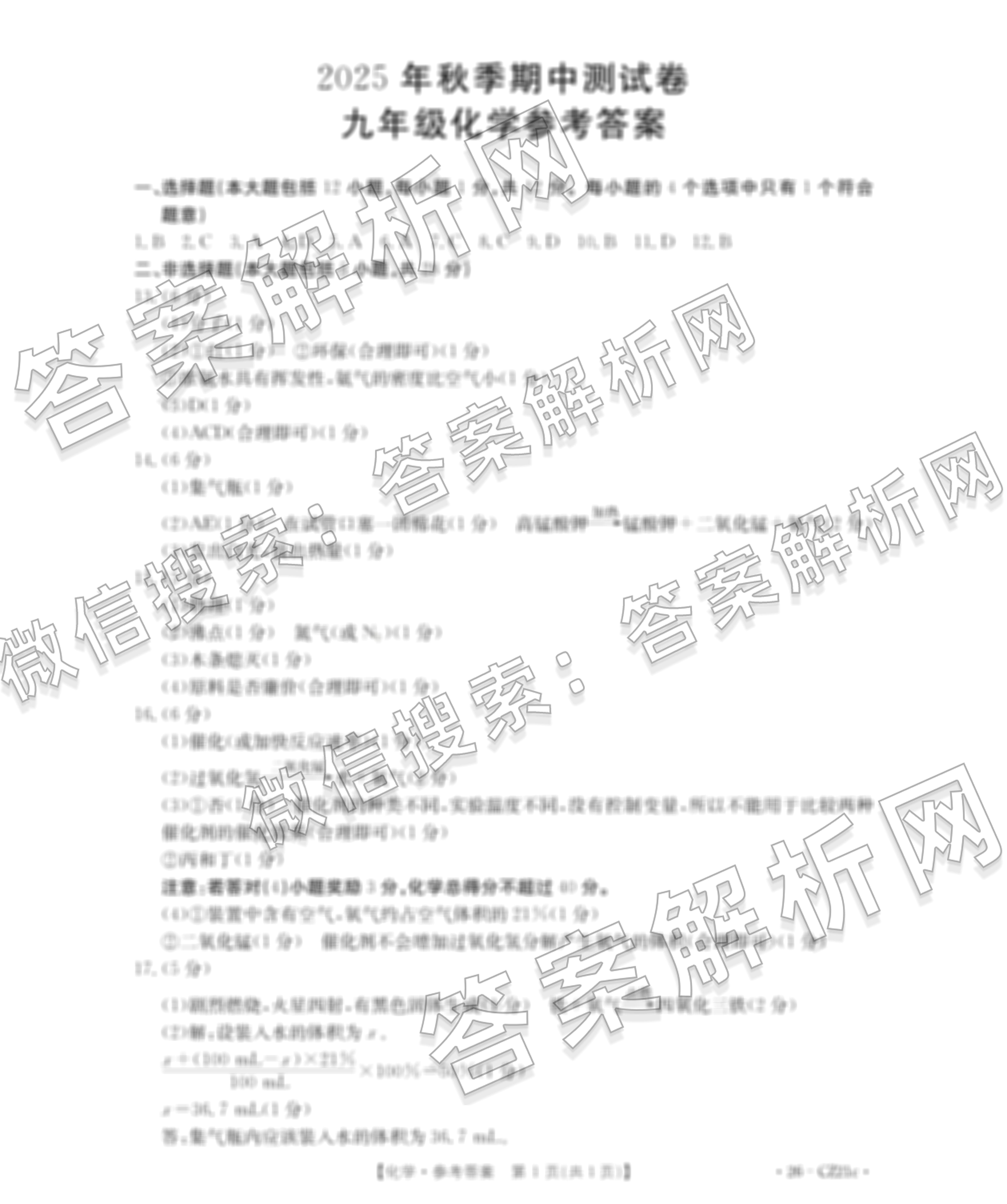 - 九年级2025年秋季期中测试卷(26-CZ21c)化学答案